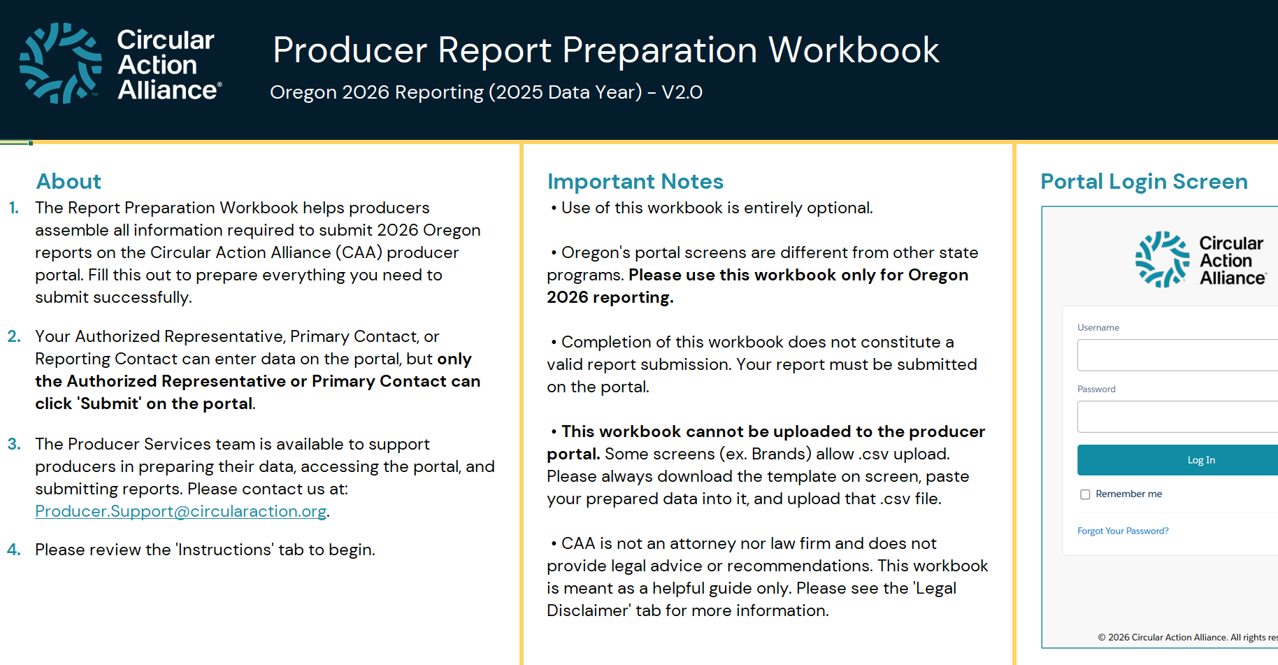 This document is an offline, Excel-based Report Preparation Workbook that mirrors the Oregon Producer Portal screens and helps producers gather the information required for entering supply data in the Portal. This document will support producers in getting ready to report before and during logging into the Portal.