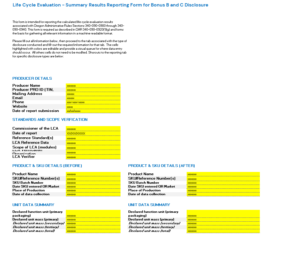 DEQ has provided this LCA Bonus B and C Impact Assessment form for use by producers who wish to submit an LCA for consideration for CAA’s Bonus B and C incentives on eligible SKUs and SKU batches. This impact assessment template is recommended for use but is not mandatory. Any submission format that fulfils the requirement outlined in the Oregon rules and CAA guidance will be accepted.